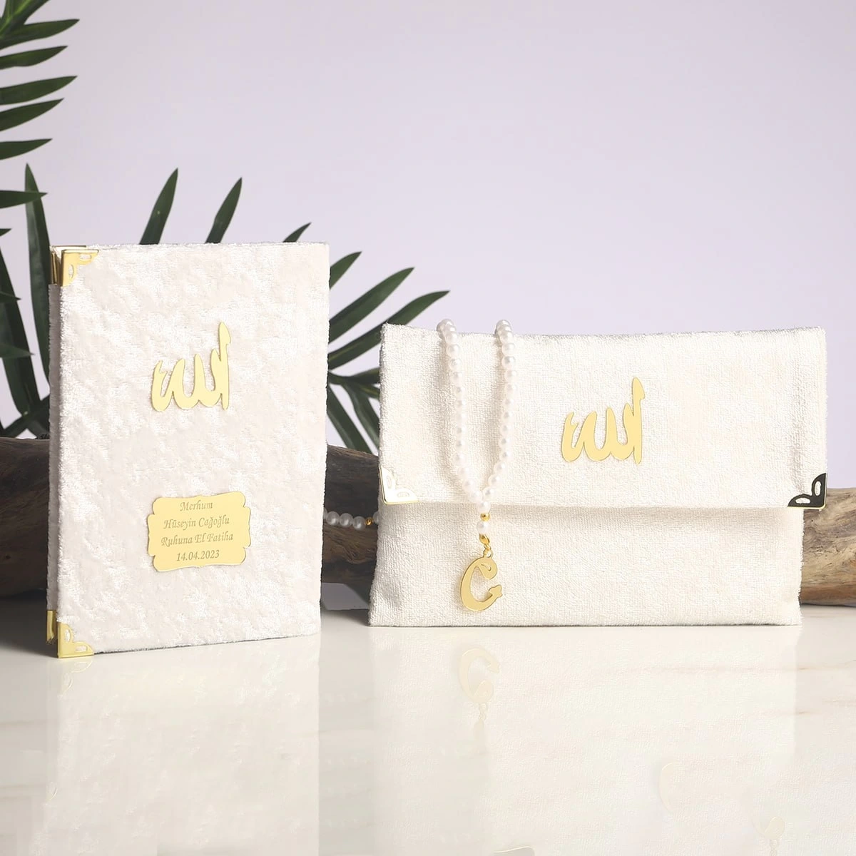 Kadife Kumaş Kaplı Çanta İçerisinde İnci Tesbihli Krem Kadife Yasin Kitabı Seti
